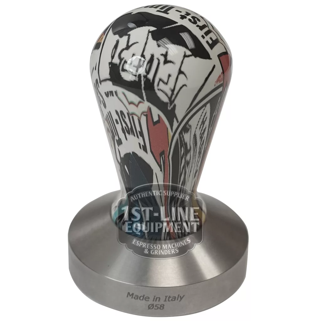 1st-line Comic tampers are made in Italy. They have a solid stainless steel 58 mm base. The handle has an artsy style to it rather than a solid dull color. Each tamper will come with its own box for storage.