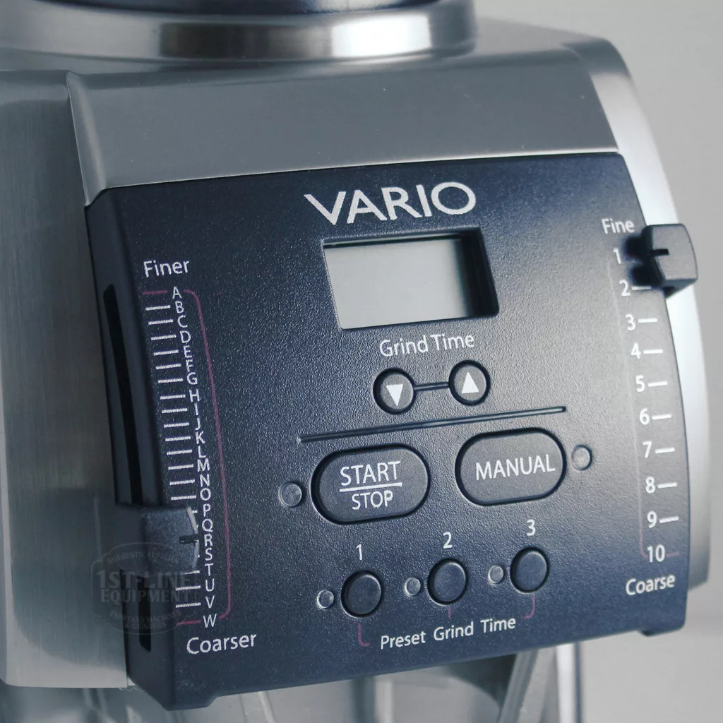 The Baratza Vario is a commercial grinder with 54mm ceramic flat burrs with a throughput of 1.9 grams per second and an innovative, macro/micro grind adjustment with 230 settings. The sleek contemporary design, small foot print, and adjustability for any style of coffee also make it perfect as a home grinder. Effective 3/25/2010, 1st-line now carries the Vario with the upgraded sleep mode, and timer with battery backup.