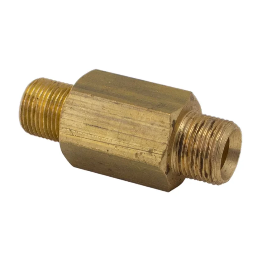 The Bezzera 5302079 Fitting M14xM13 is a brass hex nipple with male threads on both ends and a hexagonal center for easy wrench tightening when joining two female-threaded pipes or fittings. © 2025 1st-line.com