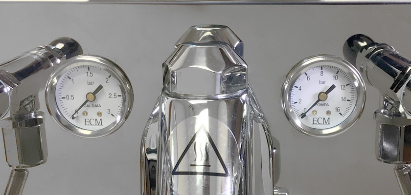 - Brew pressure gauge: Located on the right. Measures from 0 to 16 bar. Optimal pressure is between 8 and 10.