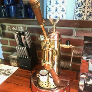 An Elektra Microcasa a Leva Espresso Machine with a pressure gauge and eagle figure on top sits next to a cup, partially covered by a yellow More Colors Available banner. © 2025 1st-line.com