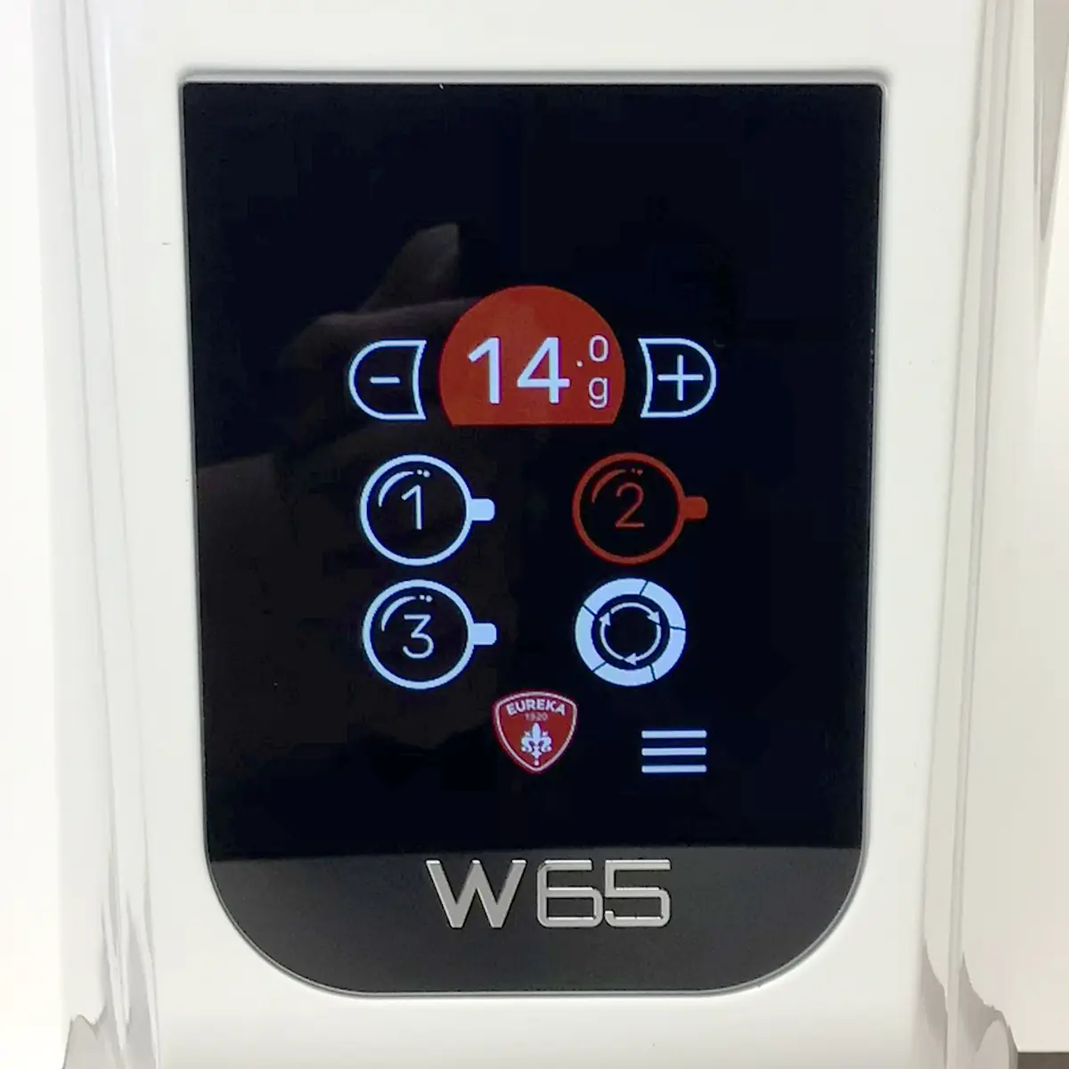 Easy to use touchscreen controls for grinding. Simply choose 1 of 3 programmable dosing options, and then place your portafilter on the fork. The dosing options can be programmed from 3 grams up to 99.9 grams. Semi-automatic dosing is also available. The menu button is in the lower right of the screen which gives access to: