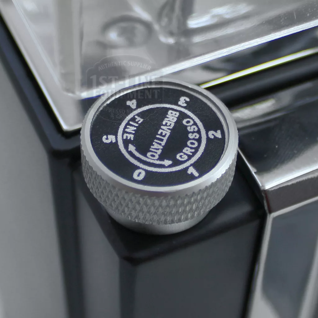 Allows for precise adjustments to the grind setting. The adjustment dial is on the top left of the grinder underneath the bean hopper. When you turn the dial clockwise, it will result in a finer grind. Turning counter clockwise will result in a coarser grind.