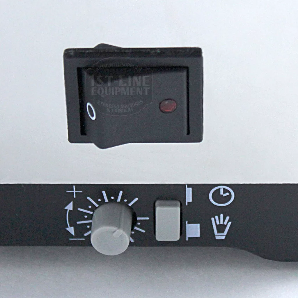 Located on the right of the grinder. The large switch turns the grinder on. The button on the lower right switches the grinder from semi-automatic (pushed out) to timer (pushed in). The knob on the lower left adjusts the amount of time the grinder will run. Turn clockwise to increase time and counter clockwise to decrease time. Pushing the pressure plate in front of the grinder underneath the coffee chute will start grinding!