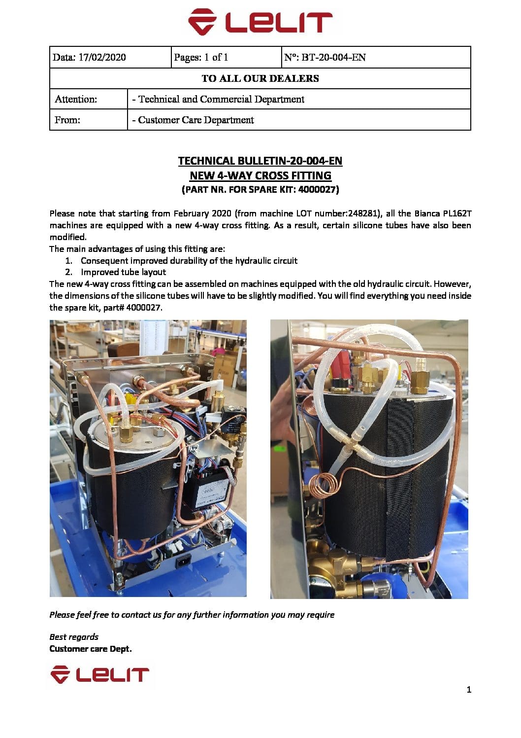 The Lelit MC4000027 kit is primarily designed for the current models of the Lelit Bianca Dual Boiler Espresso Machine which have the internal plastic Y pipes. Each of the current espresso machine models consists of a new 4-way cross fitting. Therefore, this means that select silicone tubes have been changed.