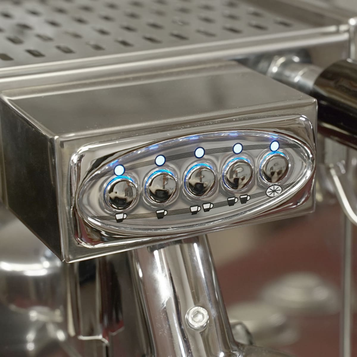 - A row of 5 buttons just above the grouphead for pulling your espresso shot. The first four are programmable and the last one is for your manual start/stop shot pulling.