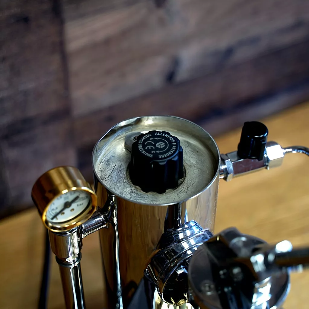 - Pressure gauge – Shows steam pressure in the boiler. The needle in the green zone indicates optimal time to extract espresso. Standard pressure ranges anywhere between 0.8 – 1.3 bar.