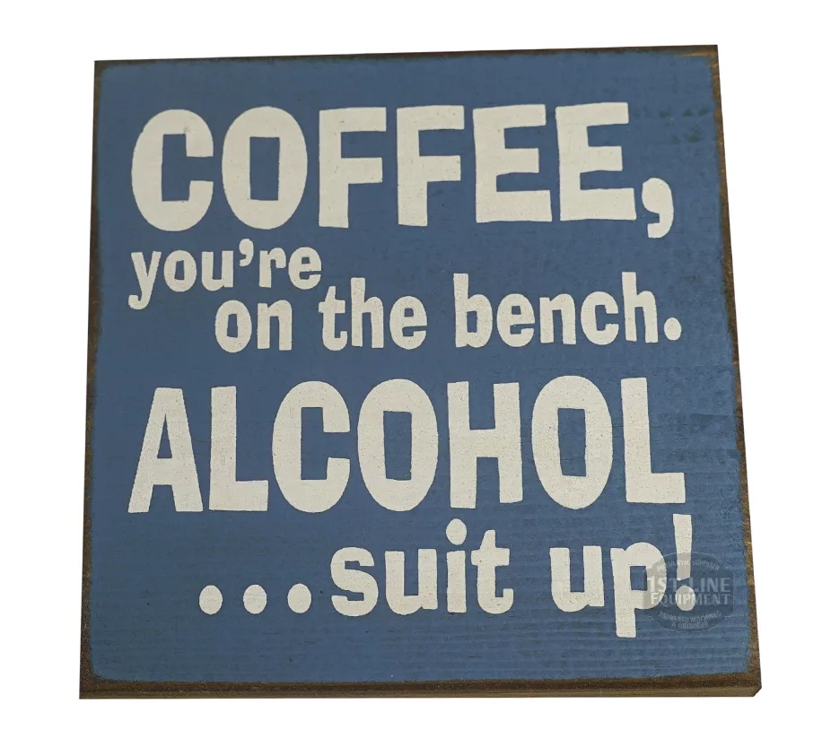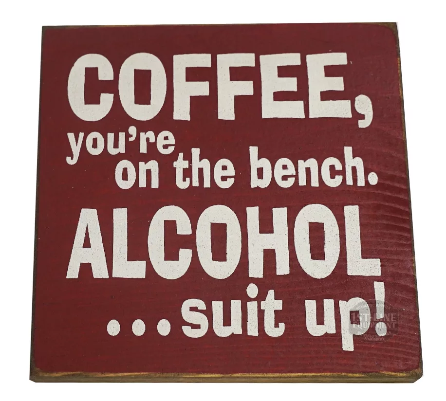 “Coffee, you’re on the bench. Alcohol…suit up!” Sign