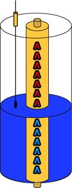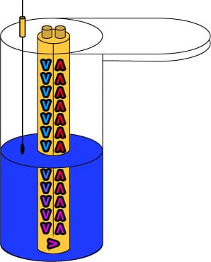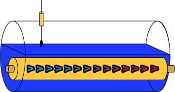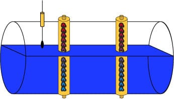 Below are four generic representations of typical heat exchanger systems. Each diagram is a cylinder representing the boiler, either a horizontal orientation or vertical. The blue in the boiler represents the water level. The black line with the yellow sleeve represents the autofill sensor.