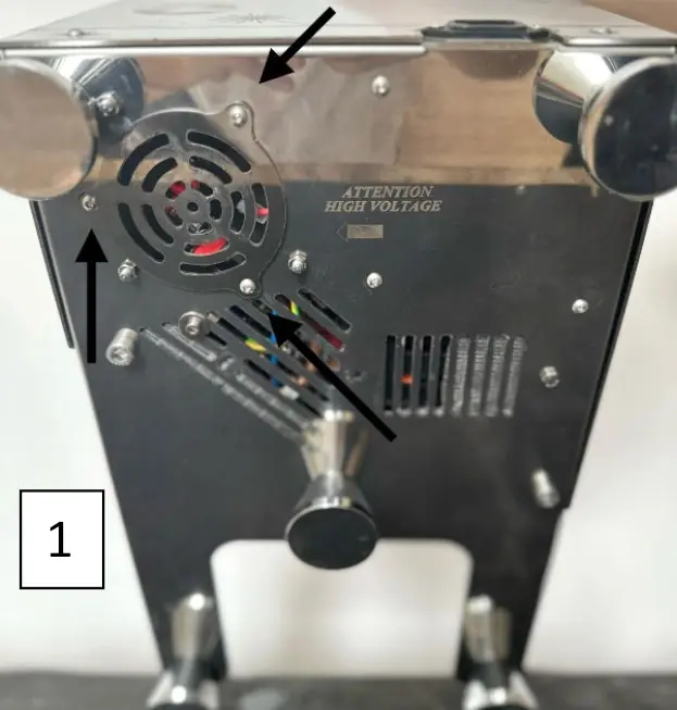 - Unscrew the plate underneath the machine (photo 1) using a 2.5 mm hexagonal wrench. There are 3 screws total.
