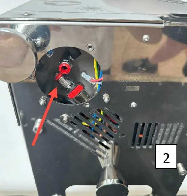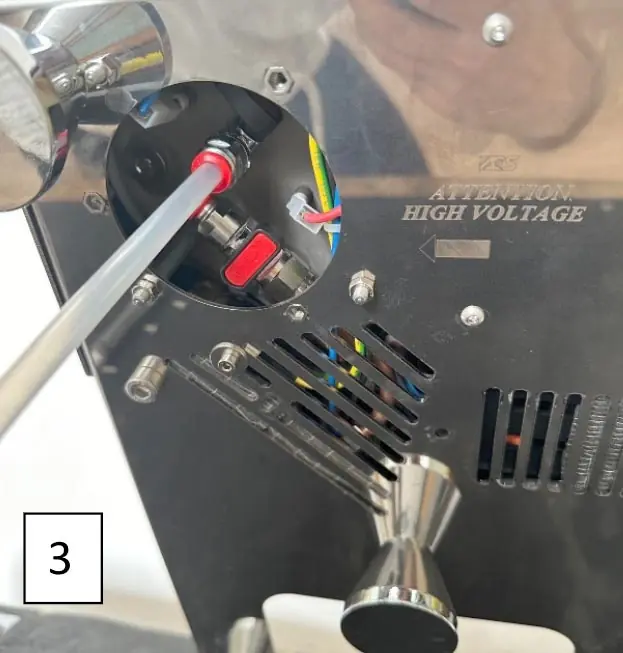 - To empty the coffee boiler, insert the supplied PTFE tube (photo 2) and open the valve to let all the water out. If you are having difficulty, you can remove the back panel of the machine for easier access.